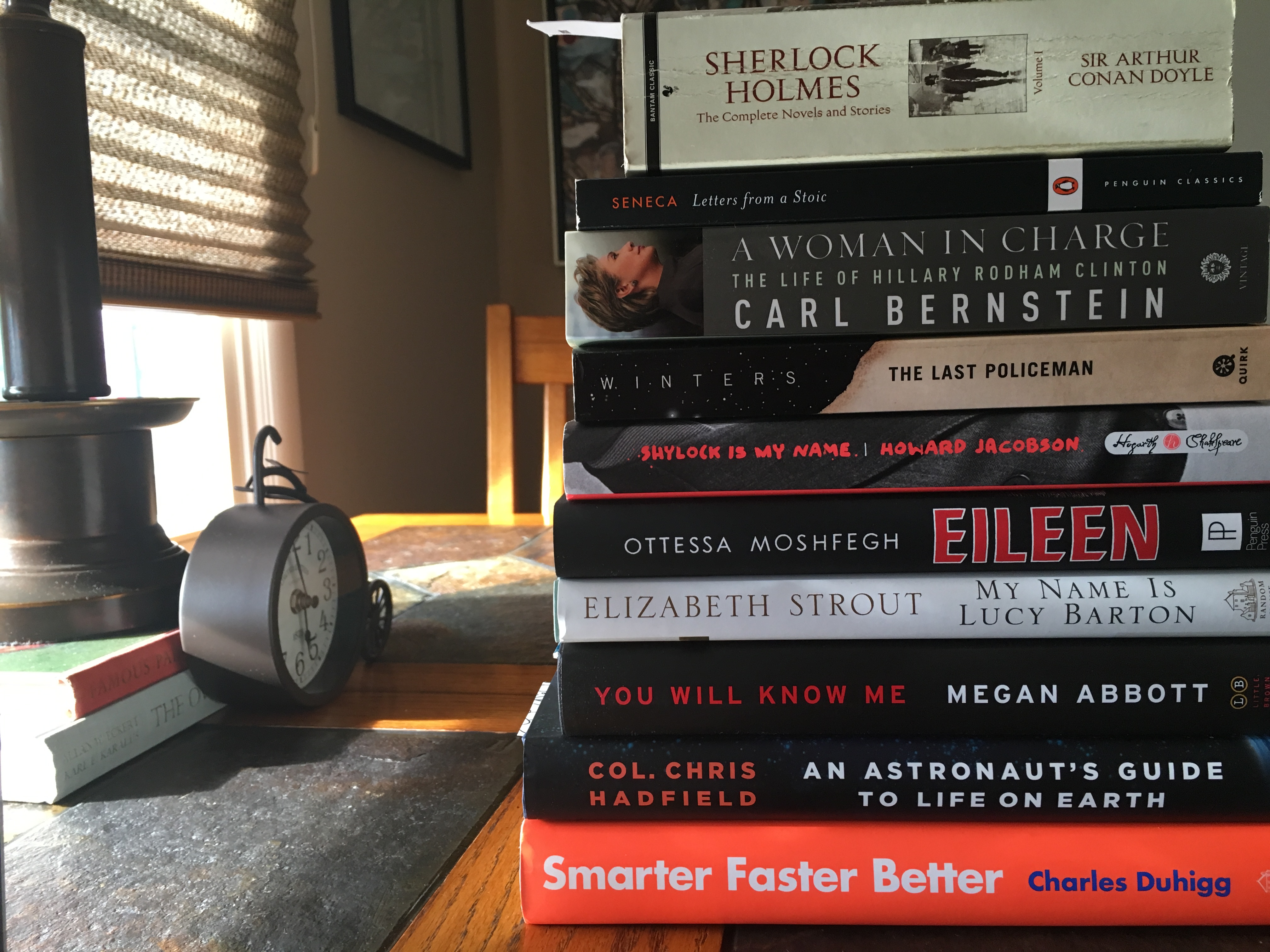 Some notes: The Doyle is for the online book club / MOOC in which I participate, and I am already halfway through the Duhigg. (In 2012, I received a review copy of Duhigg’s The Power of Habit and thoroughly enjoyed it. While somewhat engaging, this latest effort seems slapped together from research assembled when that earlier book was being written.) I’m motivated to complete Jacobson’s entry in the Hogarth Shakespeare series before we see The Merchant of Venice. The Last Policeman, Eileen, My Name Is Lucy Barton, and You Will Know Me were shelved in my bedroom, which is as good as saying, “They were already on a TBR stack.” My youngest maintains that Astronaut’s Guide will be the perfect antidote to the angsty whine of Lab Girl. I put Seneca’s Letters and the Clinton bio on my summer reading shelf in May, then promptly forgot they were there! The former will be perfect for the drive home from university, eh? And the latter will probably be read in bites over this month and next.