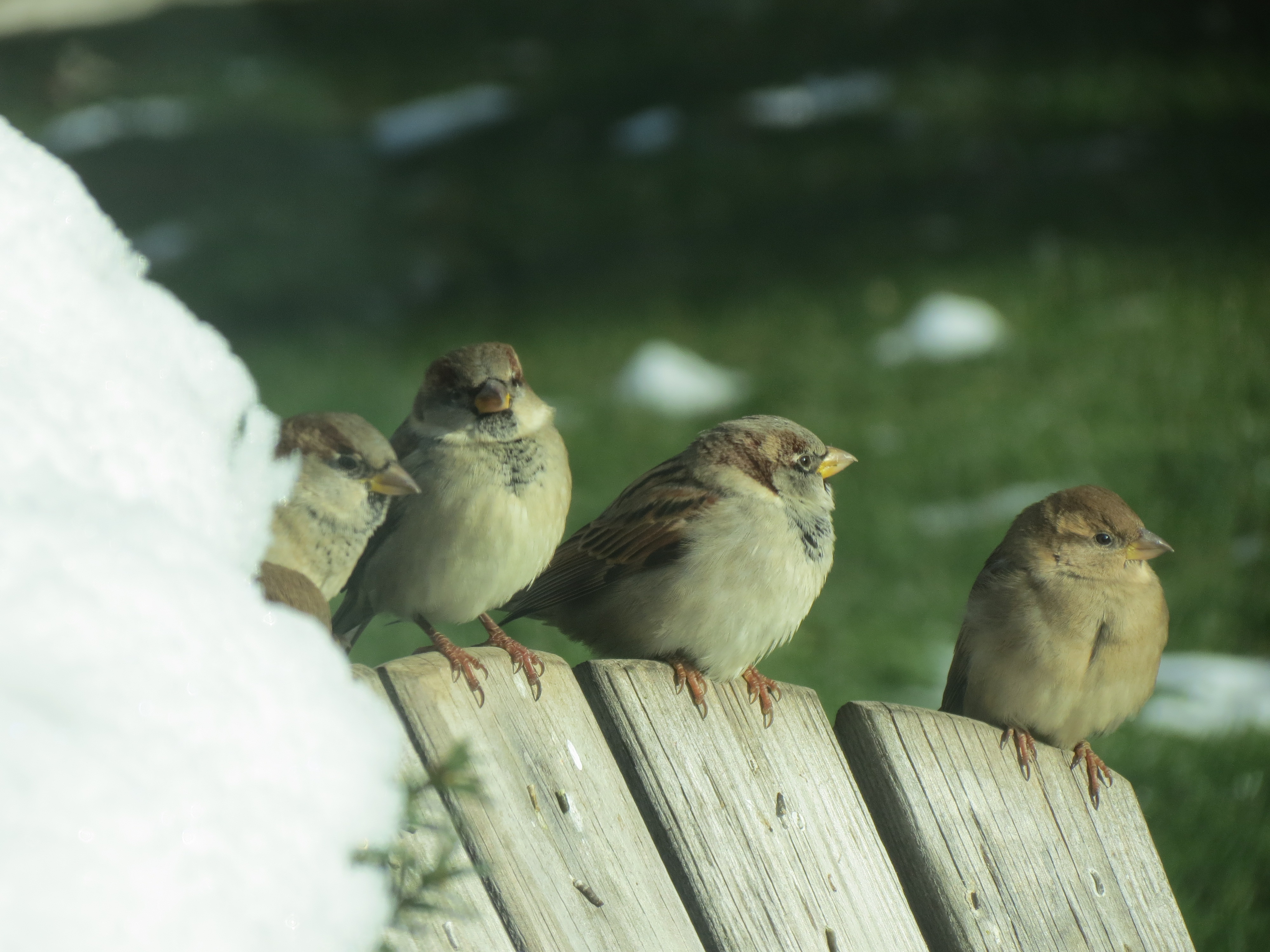 As I shared here, the bird I first espied this New Year’s Day was a house sparrow — one of a sizeable tribe that calls our yards home. After making my Project FeederWatch observations this week, I captured a few images. Would that I had had the camera out when the hawk chased several birds into the picture window and then stunned itself on it! (All survived the mishap.) It has been cold, so I have not yet removed the ghostly bird prints etched into the glass surface.