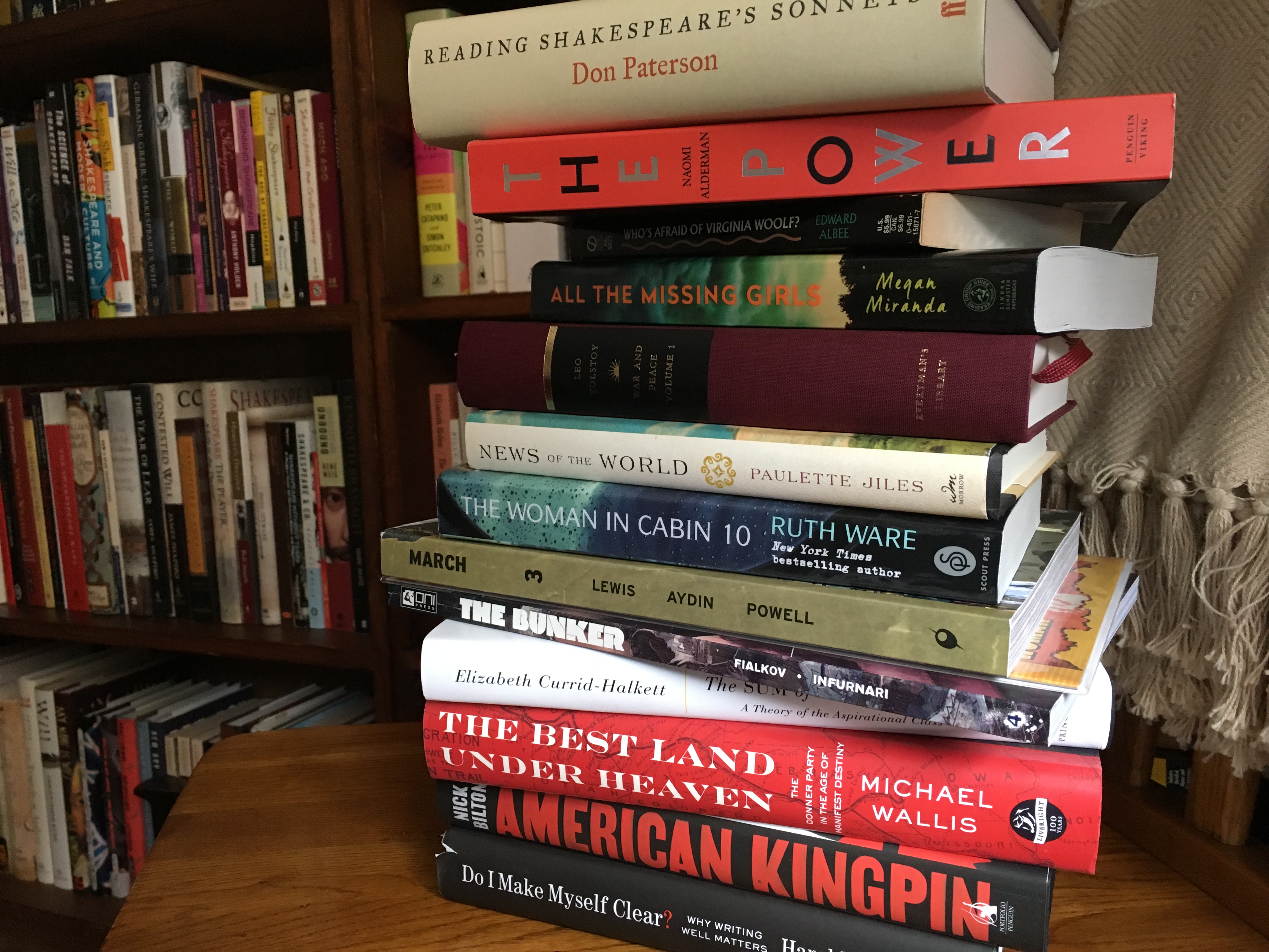 Other notes: I reread Who’s Afraid of Virginia Woolf? in anticipation of the National Theatre Live broadcast. So much to press into the commonplace book, but this is destined to become a family favorite: “Martha, in my mind you’re buried in cement right up to the neck. No, up to the nose, it’s much quieter.” The Power promised more than the fragmented writing could deliver. March is one of those books that demonstrate just how important and powerful the graphic work genre is. I think I will need to reread the first three volumes of Bunker to make any sense of what is happening now. So much time passes between releases! The three four books on the bottom represent my TBRN (to be read next) pile. We’ll have to see if that plays out.