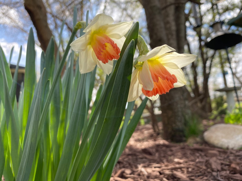 April 22, 2021 Fluttering and dancing in the breeze By Nerdishly ¶ Posted in nature ¶ Leave a comment We planted daffodil bulbs years ago, but I think these are the first blooms. Ordinarily, I don’t care for this variety, but today they seem simply splendid.Share this: Click to share on X (Opens in new window) X Click to share on Facebook (Opens in new window) Facebook Like Loading... Related