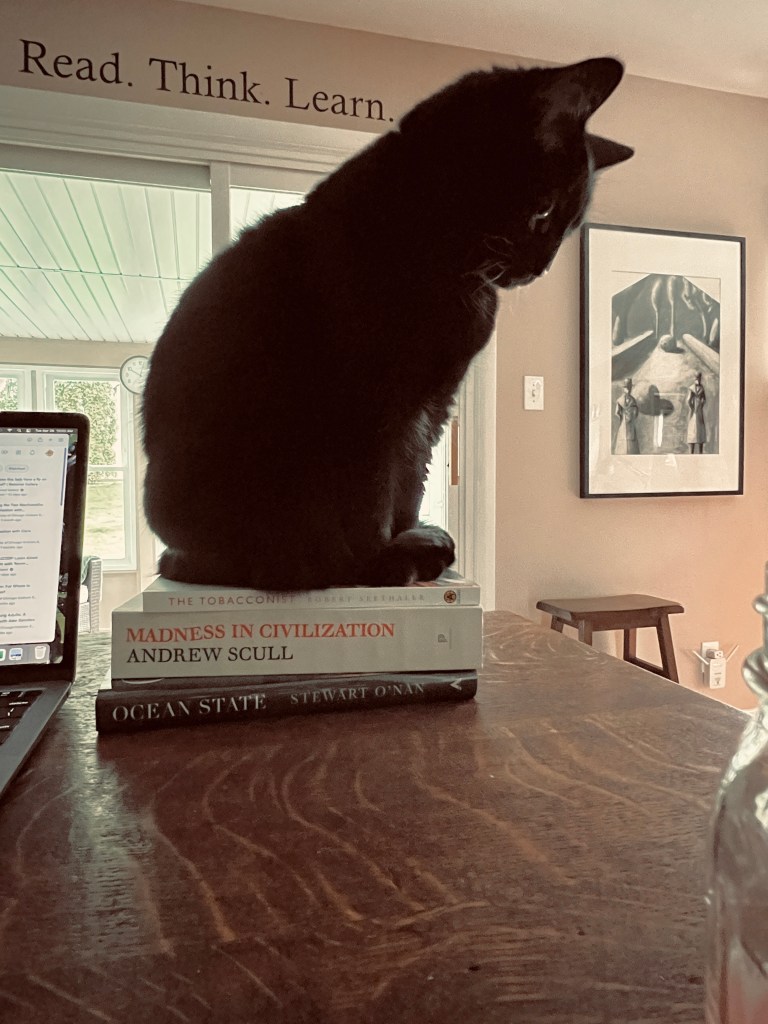 • I do, too. I also like how this pic captures a bit of the kitten she was. (She’s fourteen now.) Every once in a while, I’m able to grab a photo of her leaning on or perched atop a stack. Cracks me up (even if my image is mediocre).