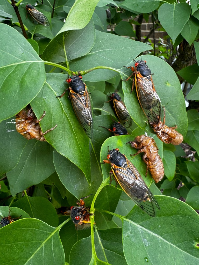 • And that is only a wee bit of what’s happening in my yard. And my place is actually experiencing only a mild emergence compared to the yards I see on our daily walks. Some lawns literally writhe with cicadas in various stages.