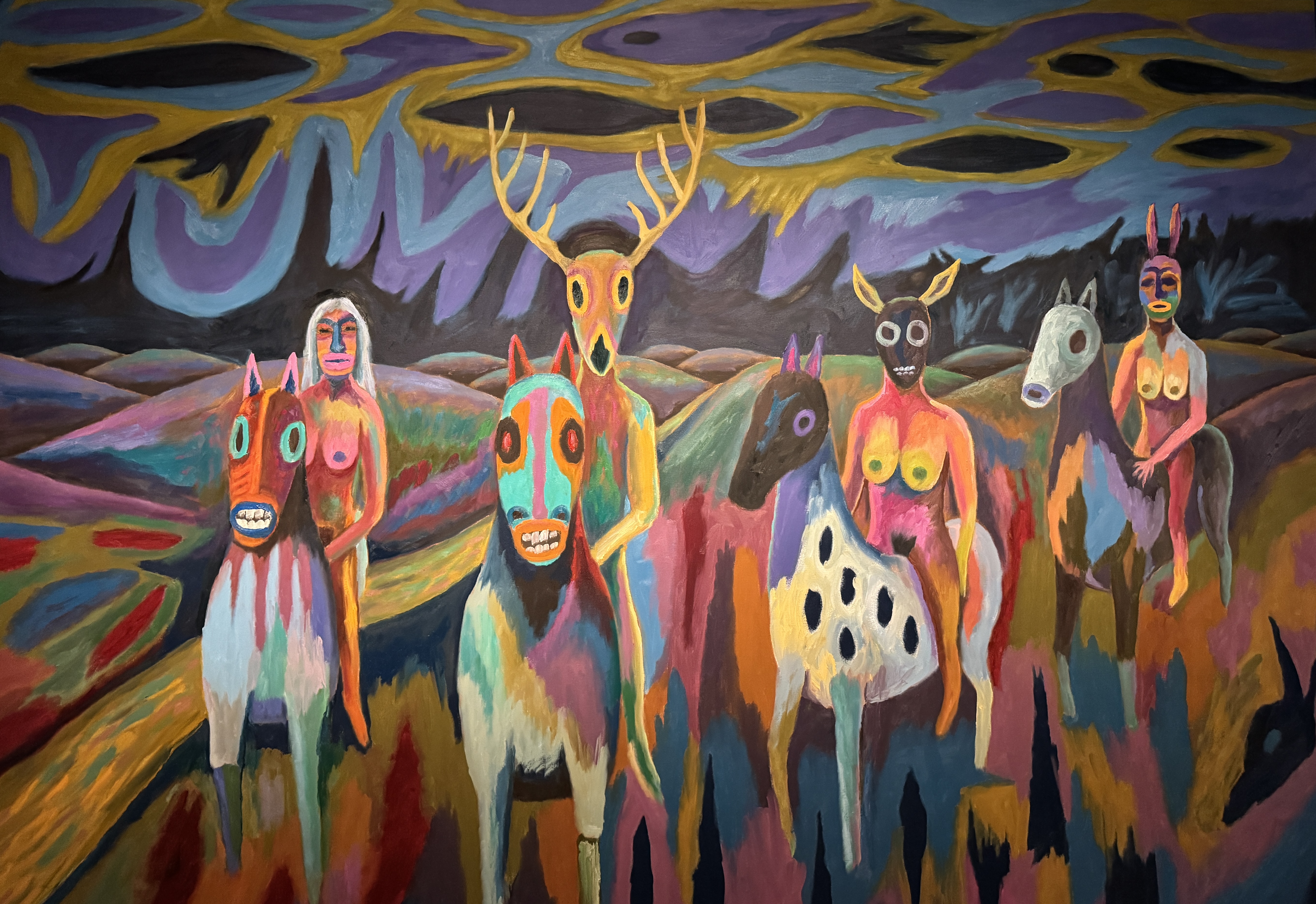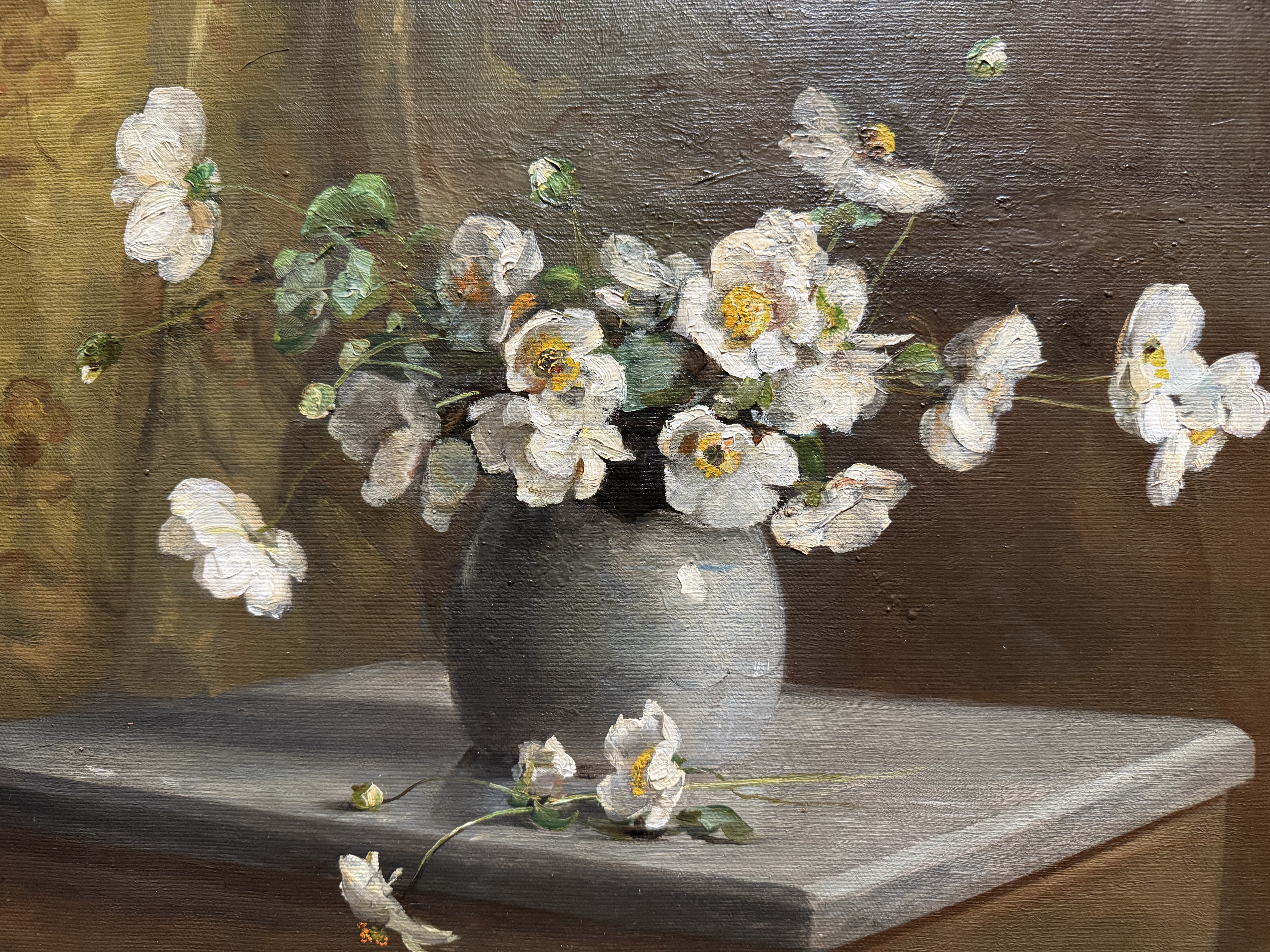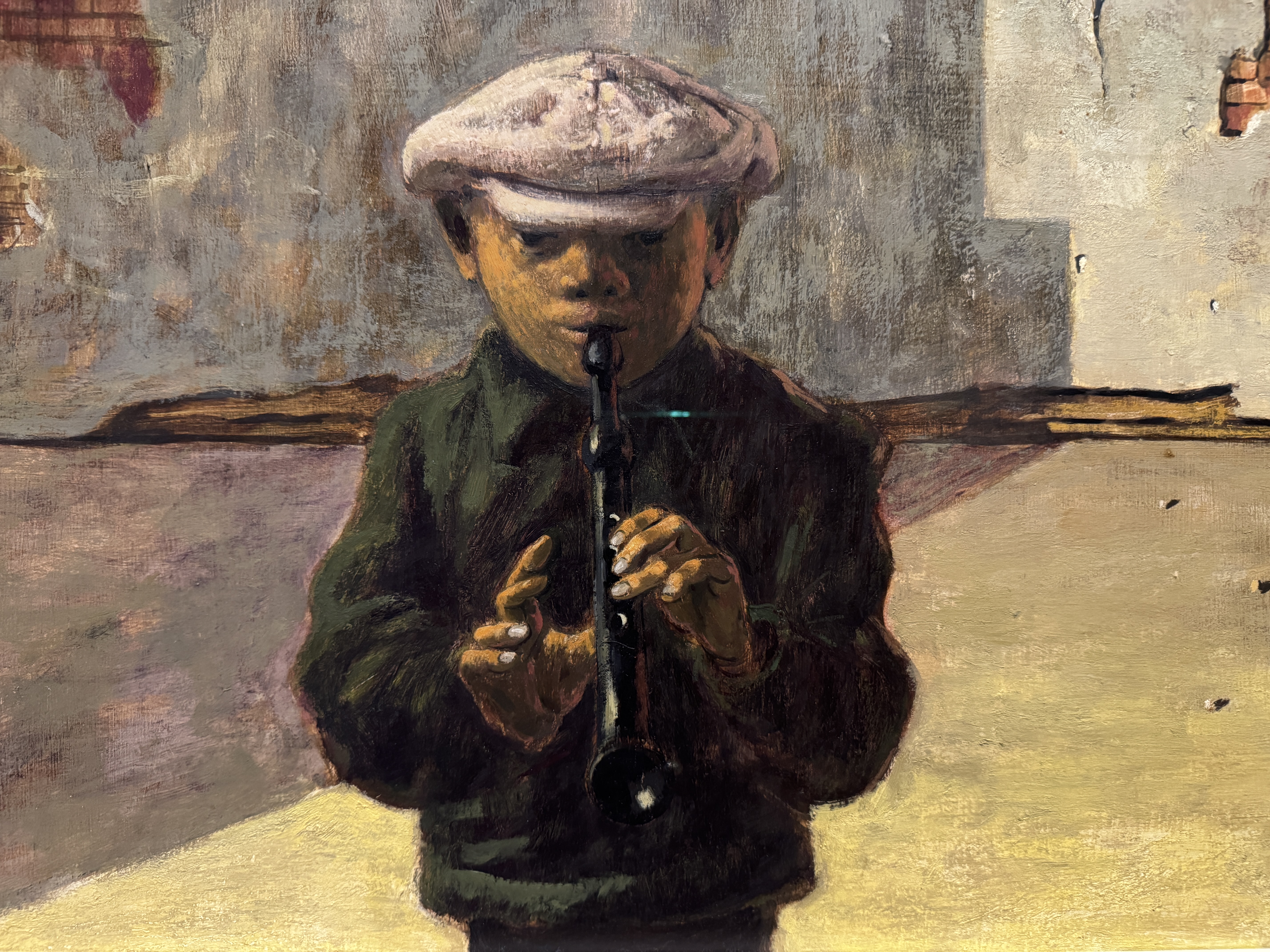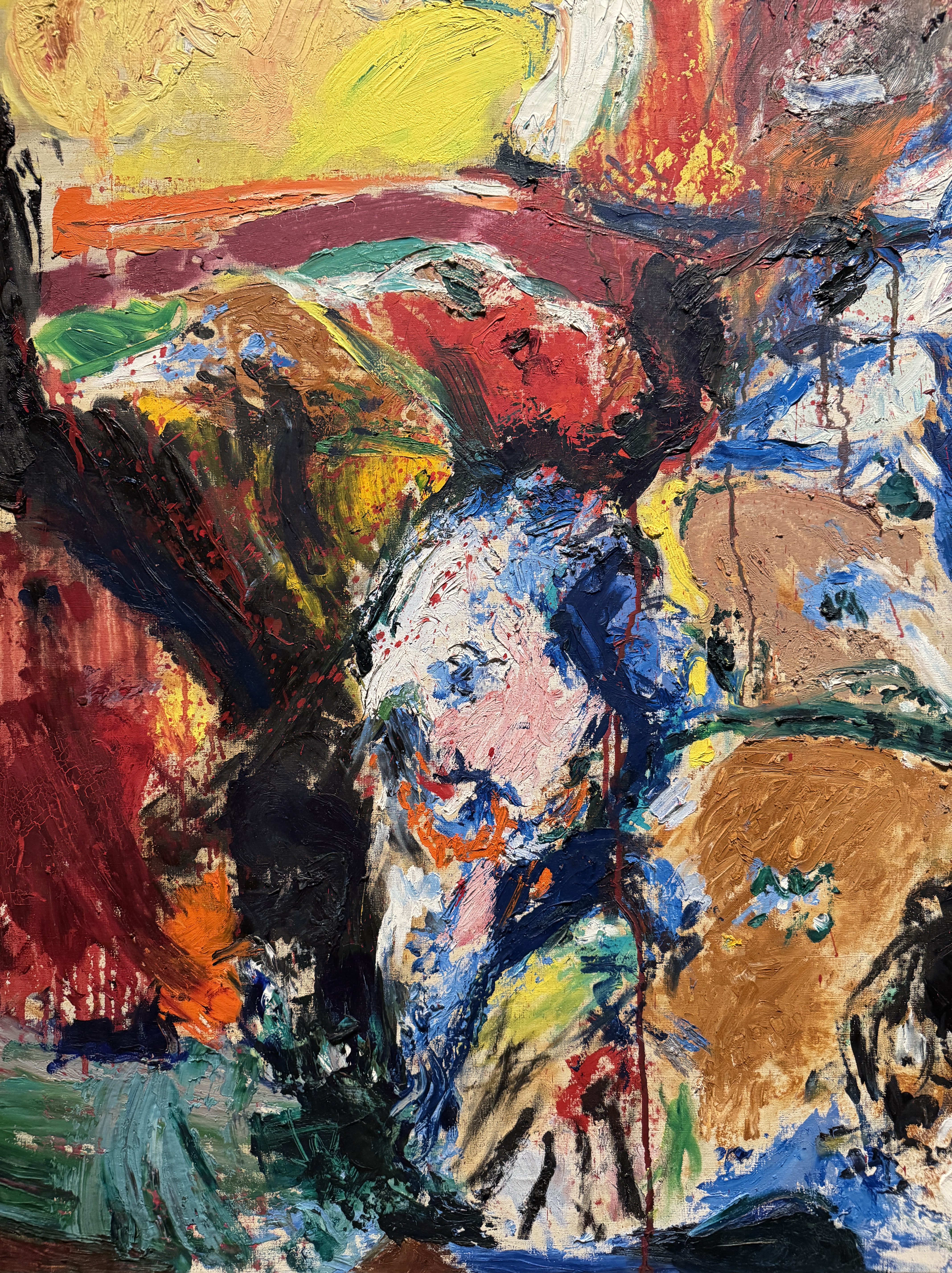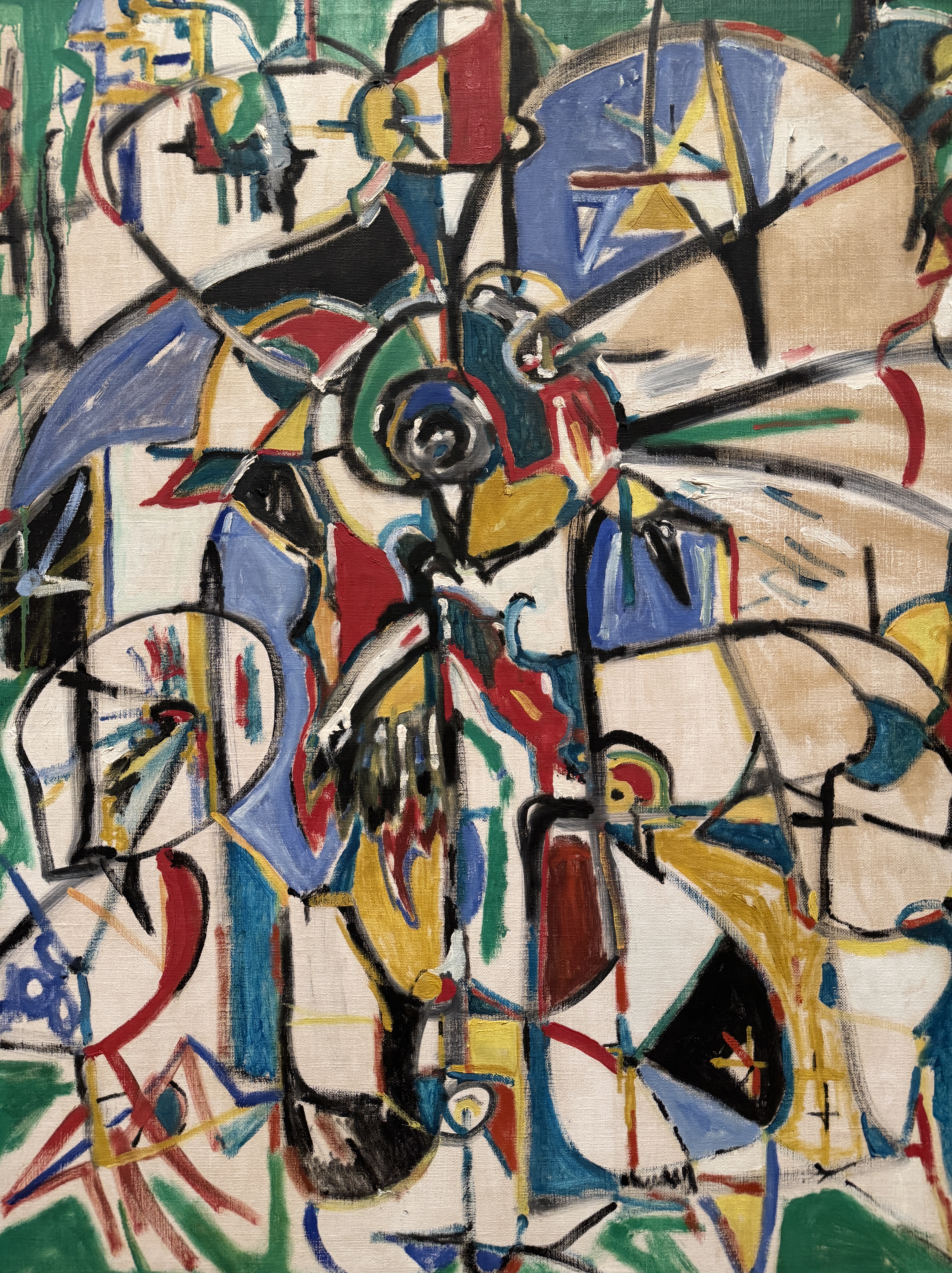 The above are my images of details of the following works of art: Le Jardine (1959-60) by Herbert Gentry; Floral Still Life (1880-90) by Charles Ethan Porter; The Piper (1953) by Hughie Lee-Smith; Four Days and Four Nites (2019-2020) by Jim Denomie; and The Suicide of Mr. H. (1961) by Asger Jorn.