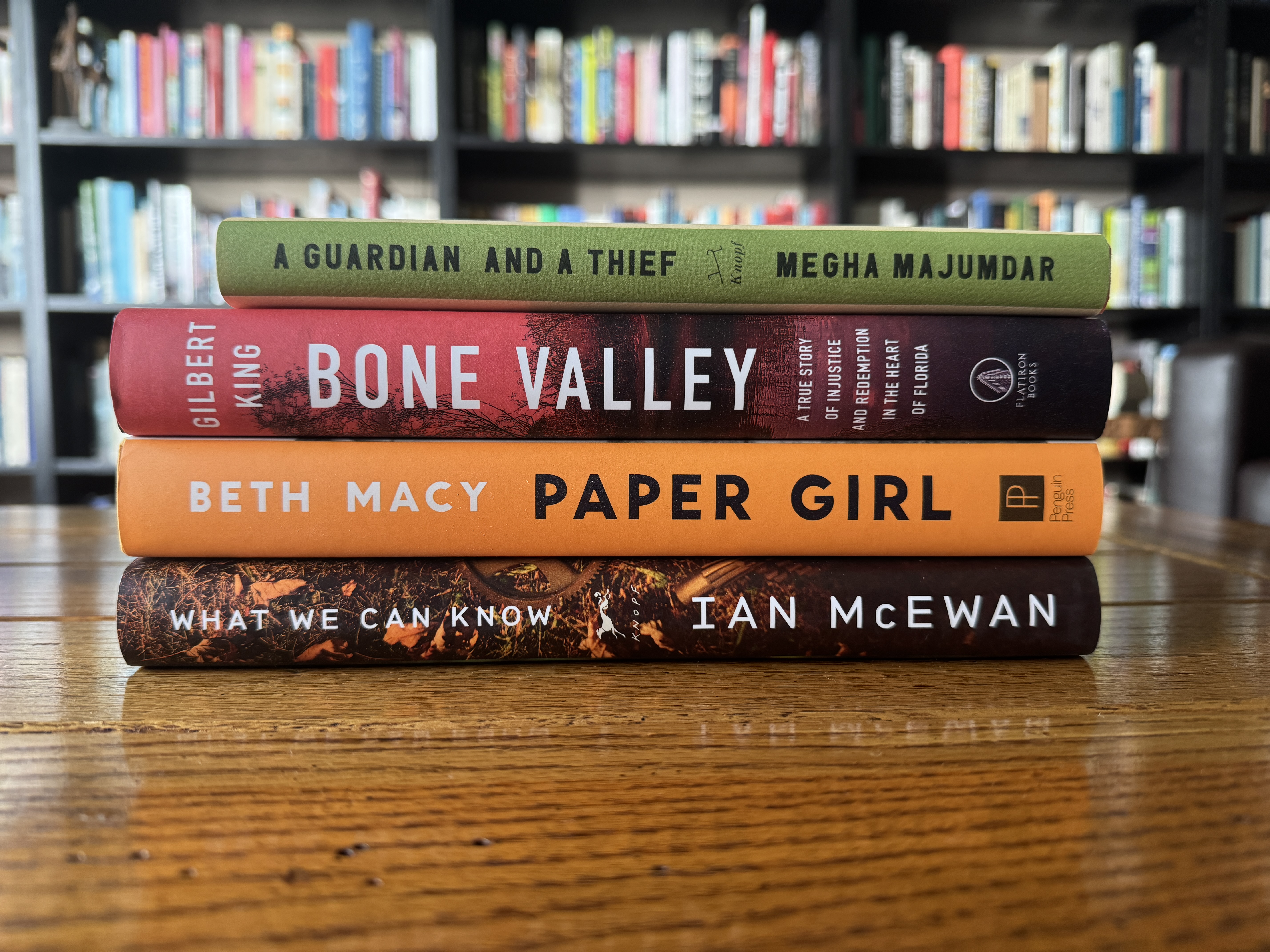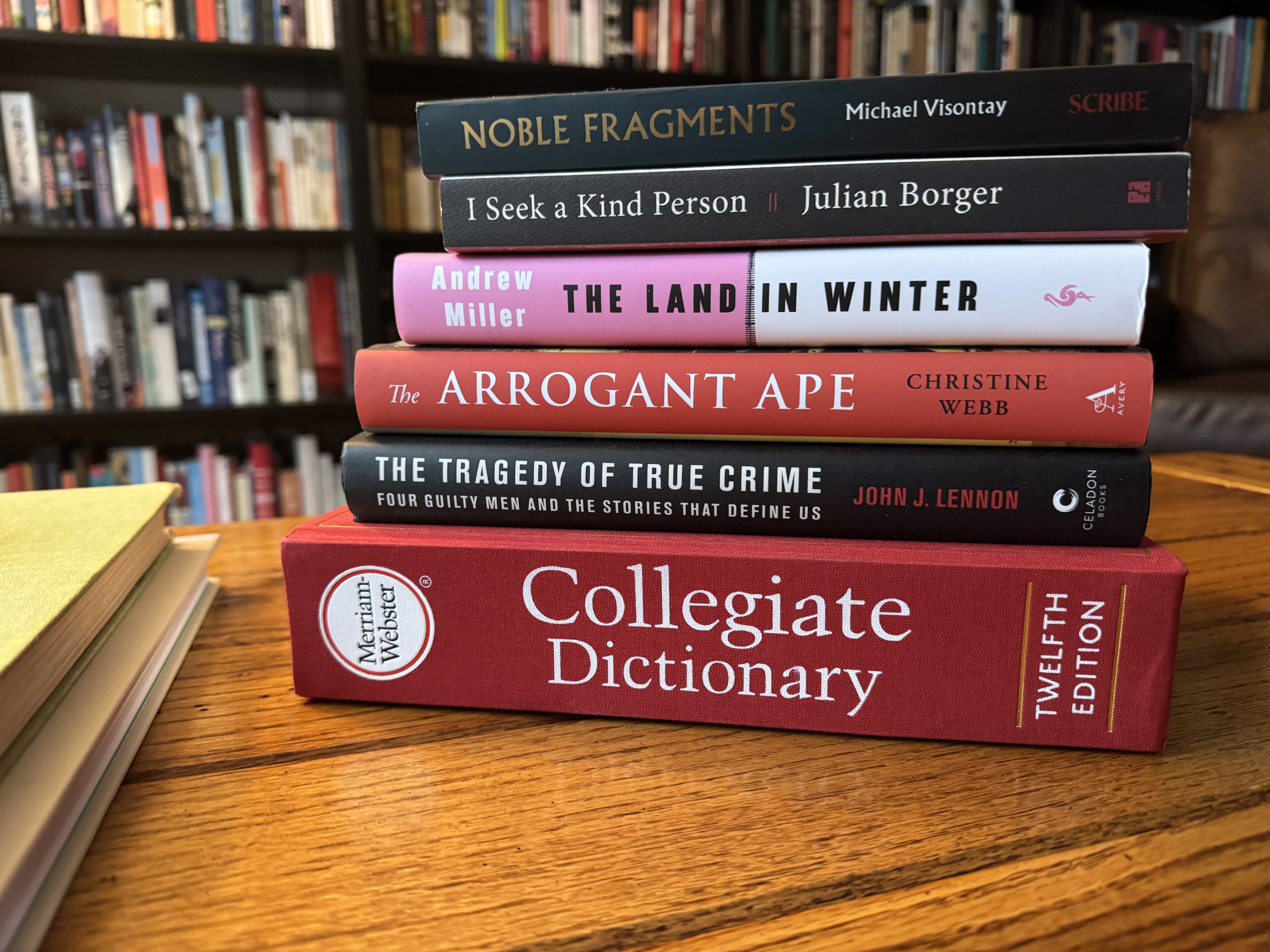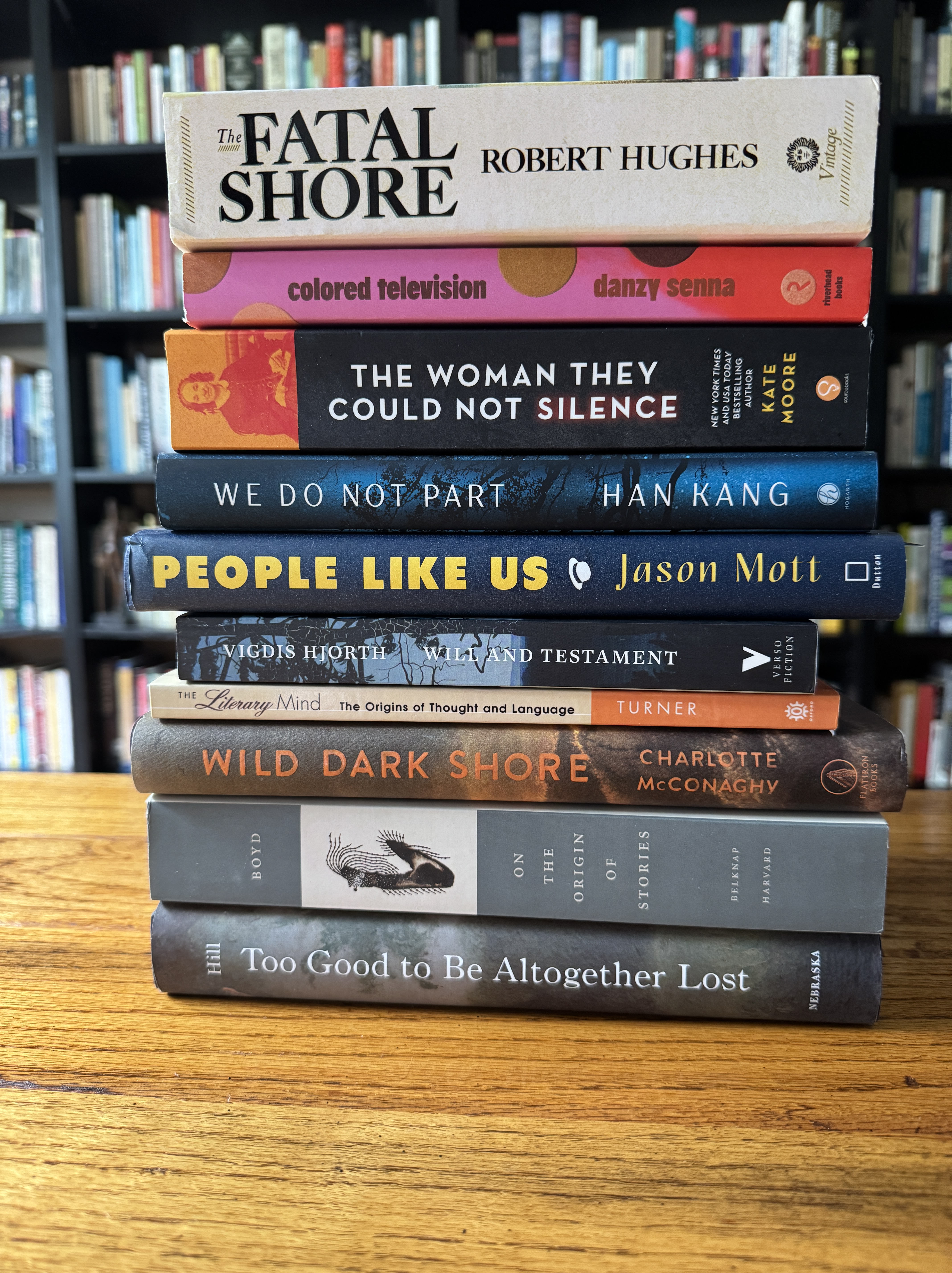 These recent acquisitions were shelved because my current stack is so tall that my youngest gently joked about it throughout her recent visit. She was not wrong. I also shelved The Remains of the Day (Kazuo Ishiguro; 1989), which I (re)read with Commonplace Philosophy (this book was even more beautiful three-plus decades later), and the subtle, haunting Under the Eye of the Big Bird (Hiromi Kamakami; 2025 — review here). I’ve shelved Stephen Fry’s Troy (2021) for now because I am working though Aristotle’s Nicomachean Ethics and secondary sources for study group and David Copperfield (Charles Dickens; 1850) for a UChicago Graham School course, plus Latin and music practice. The currently reading stack now looks a wee bit more manageable.