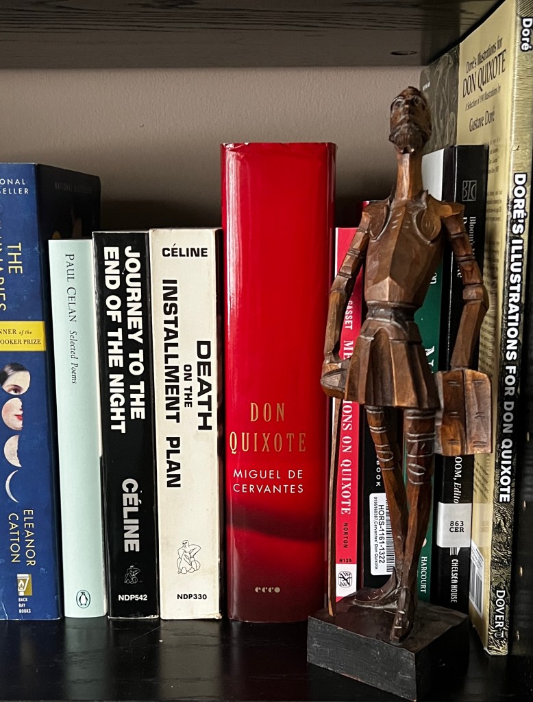 Because I am also studying Moby-Dick this semester, I appreciated Harold Bloom’s assertion (see introduction to the Edith Grossman translation) that “Melville blended Don Quixote and Hamlet in Captain Ahab (with a touch of Milton’s Satan added for seasoning).” Returning to a book again and again (and again), as I have Moby-Dick, creates a familiar, well-creased mental map. With this, a reader can travel along the accustomed channels or more easily attempt new routes (meanings, metaphors, implications, associations, links to other works, etc.). On my current voyage through Moby-Dick, for example, I have been navigating ideas about how Melville (perhaps as Ishmael, perhaps as the story’s creator) shapes the narrative and what, precisely, we readers are meant to understand as truth in that narrative. Oh, how I wish I had something even approaching that level of familiarity with Don Quixote because Cervantes is also clearly experimenting (perhaps we can even say, playing?) with narrative structure and truth, but I have only the barest outline of a mental map by which to chart my course through this vast novel.
