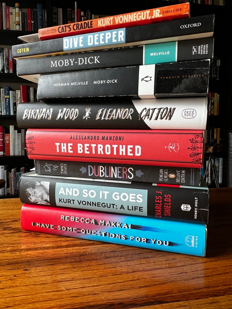 The morning has run off without me, but I will catch up to it soon enough. In the meantime, I’ve just finished some desk work and tomorrow’s chapters of Bleak House (Charles Dickens; 1853), which I’m reading with APS Together. Other reading this week includes The Dispossessed (Ursula K. LeGuin; 1974) for a short course with NYR Seminars; The Amazing Adventures of Kavalier and Clay (Michael Chabon; 2000) and the Stanley Lombardo translation of The Iliad for courses with Roundtable by The 92nd Street Y; and Moby-Dick, this time with Samantha Rose Hill.